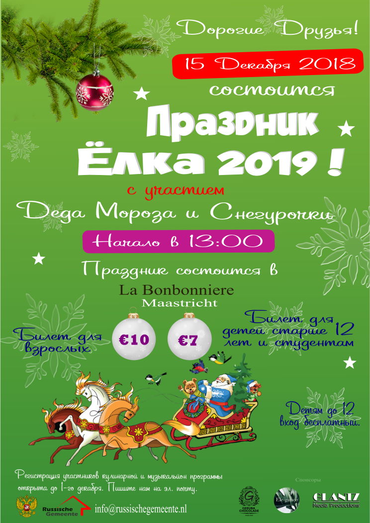 Openbaar · Georganiseerd door Новогодний бал. Состоится Новогодний банкет. В этом году мы подготовили для Вас банкетный зал класса премиум. С большой бесплатной парковкой. Гостей встречают в холле с бокалом шампанского, где они могут пообщаться и познакомиться друг с другом, в это время наш фотограф сделает для Вас снимки около Новогодней ёлки с Дедом морозом и Снегурочкой, которые потом можно будет скачать на нашем сайте. После сбора гостей мы приглашаем занять их свои места, столы пронумерованы и у каждого места будет именная табличка с именем гостя. Столы по 10 и 12 человек. Для вас работает команда поваров и официантов, каждый стол будет накрыт к приходу гостей, что бы гости могли себя максимально комфортно чувствовать, а не отстаивать очереди в буфете. Холодный стол состоит из 9 холодных закусок и всеми нами любимых салатов, таких как салат Оливье, селедка под шубой, мясная нарезка, овощное ассорти, сырная тарелка, соленья, овощные салаты, куриные крылышки, фаршированные блинчики, копченый лосось, хлеб, масло, соусы. Так же будет предложено 2 горячих, которое будет подаваться так же на столы. На десерт мы предлагаем наш фирменный торт, включены все прохладительные напитки, бутылка вина на 2 человек. Мы встречаем наших гостей бокалом шампанского, а так же для каждого - бокал шампанского под бой курантов! (Гости могут принести с собой 1 бутылку элитного алкоголя на свой вкус, это не возбраняется). Позвольте Вам представить Вокально - инструментальную группу «Старый двор», которая также известна в Бельгии и Голландии как «The Culture Kings» . Репертуар группы широк и разнообразен. Они виртуозно играют классику, jazz, blues, pop музыку, шлягеры, а так же все известные мировые эстрадные хиты на русском, французском, английском языках. Руководитель группы : Игорь Беер окончил Одесскую консерваторию по классу скрипки, а так же Джаз студию Антверпен. Виртуозно играет на фортепиано, скрипке, гитаре, аккордеоне и бас-гитаре, синтезатор. В Бельгии работал в составе групп : Little Rock & Axel, Harley Blues band, Eighty-one 81, The Culture Kings. Несколько лет он играл на международных круизных лайнерах. Помимо музыкальной карьеры он занимается преподавательской деятельностью, обучает игре на гитаре и фортепиано детей и взрослых. Тел. 0488 98.04.08 Армен Бекназарян, окончил Ереванскую консерваторию по классу скрипки. Помимо участия в ансамбле, он также играет в симфоническом оркестре в Бельгии. Ранее он играл в государственном симфоническом оркестре Армении, с которым они неоднократно выступали на телевидении и участвовал в международных гастролях. Leo Verstrepen, бельгиец, обучался джазу и классической музыке в Бельгии. Играет на кларнете и тенор-саксофоне. Раньше он выступал в различных джазовых, дикси и блюзовых группах. Хорошо знает и любит русскую культуру и музыку. Здесь (нить ниже )можно послушать альбом группы «Старый двор». Но это еще не все! После 00:00 2019 года Вас ждет зажигательная дискотека, ведёт которую DJ Bartje, В его распоряжении «длинный свет», лазеры, что бы сделать световое шоу незабываемым.