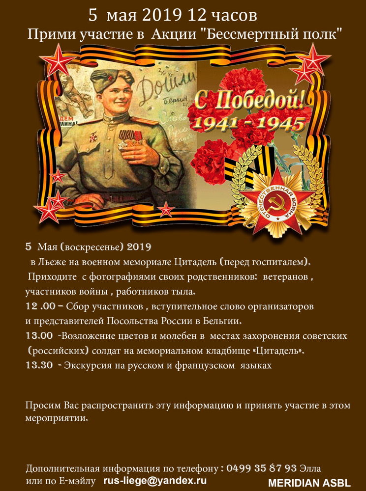 => 19/4 Black Horizon (Charleroi) => 1/6 Une saison russe (Thonon-les-Bains) => 1/6 Les russes Blancs de la Riviera (Saint-Jean de Braye) => 1/7 Exposition Rouge : Art et utopie au pays des Soviets (Paris) 1 => La Pâque Russe (F-75004 Paris) 1 => Communiqué Gallipoli (Paris/Bxl) 2,9,16,23 => Géopolitique Russie (WSL) 2 => 50 ans d'amour conjugal (Watermael) 3 => 2 tickets back (Liège) 4-5 => Excursion Baden-Baden/Strasbourg 5 => Action régiment immortel (Liège) 5,11 => Сказ о Егории Храбром (Leuven/Bxl/Antwerpen) 7-9 => SEAFOOD expo (Bruxelles) 7 => Russia & China - uneasy similarities (Gent) 7 => Кыся (Amstelveen) 8 => Donbas Residents' Response to UK & RU media (Gent) 9,16,21 => Volga éternelle (Saint-Péterbourg/Moscou) 9 => In memoriam (Evere) 10 => Александр Городницкий (Francfort) 10 => Ecrivains russes dans l'émigration (Ixelles) 11,15 => Au fil des fleuves de Russie (Saint-Péterbourg/Moscou) 11 => Golems de Bruno Schulz (Chênée) 11 => Ardennes flamandes (Geraardsbergen/Audenarde) 12 => Rendez-vous avec la Russie (Koekelberg) 15 => Land and Sea Silk Road (Bruxelles) 15 => Platonov (Diest) 15 => Red Haired Men (Brugge) 16 => Connecting Eurasia (Gent) 16-23 => Expo Fragments by Elvis Ways Art (Etterbeek) 16-24 => «Ваши пельмени» (Fürth) 17-26 => Александр Розенбаум tournée 2019 (Allemagne) 18-26 => JDA Travel 2019 (Moscou/Saint-Péterbourg) 19 => Carmen Suite/Petrushka - Bizet/Stravinsky (Kinepolis) 19-29 => Олег Винник (Fürth) 20-21 => CCBLR General Assembly + 3 events (Bruxelles) 22-23 => Test Russian language (Saint-Josse) 22 => Workshop CCBLR export products in Russia and EEU (Bruxelles) 25 => Excursion Hollande folklorique 26 => Живопись : до и после Брейгеля (Bruxelles) Bibliographie : Le régiment immortel. La guerre sacrée de Poutine, Premier Parallèle (Paris) Les anarchistes russes, Nada-éditions (Paris)