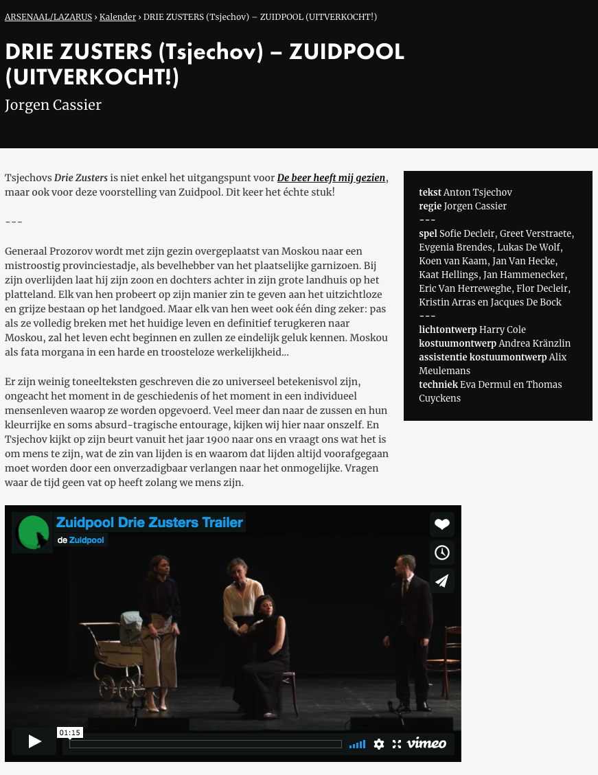 Theater Zuidpool Pas in Moskou kan het leven beginnen. Generaal Prozorov van het Russische leger wordt met zijn gezin overgeplaatst van Moskou naar een provinciestadje om daar bevelhebber te worden van het plaatselijke garnizoen. Na elf jaar trouwe dienst overlijdt hij. Zijn inmiddels volwassen zoon en dochters blijven achter. Ze proberen allemaal zin te geven aan het uitzichtloze, grijze bestaan op het landgoed, maar ze weten dat het leven pas echt beginnen kan als ze breken met het leven dat ze leiden. In Moskou is geluk pas mogelijk. Moskou is hun fata morgana. Veel meer dan naar de zussen en hun kleurrijke types om hen heen kijken wij naar onszelf. En Tsjechov kijkt mee, vanuit het jaar 1900 en vraagt ons wat het is om mens te zijn en wat de zin van lijden is. In deze voorstelling zit een pauze. Tekst Anton Tsjechov Regie Jorgen Cassier Met Sofie Decleir, Greet Verstraete, Evgenia Brendes, Lukas De Wolf, Koen van Kaam, Jan Van Hecke, Kaat Hellings, Jan Hammenecker, Eric Van Herreweghe, Flor Decleir, Kristin Arras & Jacques De Bock.