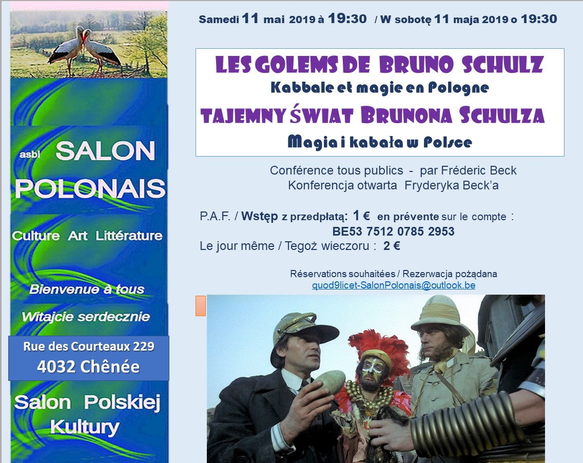 Conférence tous publics par Frédéric Beck TAJEMNY ŚWIAT BRUNONA SCHULZA Magia i kabała w Polsce Konferencja otwarta Fryderyka Becka FR Chers Amis, Réservez déjà vos places pour la soirée du samedi 11 mai. A 19:30 soyez les bienvenues à notre conférence concernant Bruno Schulz – détails sont affichés ici plus bas. Bien à vous, Asbl Salon Polonais, Rue des Courteaux 229, 4032 Chênée/ Liège. Ouvert weekends 14:00-19:00. L’exposition de petits ouevres artistiques – permanente, accessible gratuitement, ainsi que des livres rares, d'exception. Parking voitures gratuit partout dans le quartier. Bus Nr 29 du Liège centre, direction Bruyères, l’arrêt Rue du Progrès sur Chênée-Thiers. PL Drodzy Przyjaciele, Sugerujemy wcześniejszą rezerwację miejsc na konferencję o Brunonie Schulzu, która odbędzie się w sobotę 11 maja o godz. 19:30. Szczegóły są podane na plakacie niżej. Kulturalnie z Państwem, Salon Polskiej Kultury, Rue des Courteaux 229,, 4032 Chênée/ Liège. Lokal jest otwarty w weekendy, w godzinach 14-19:00. Do obejrzenia gartisowo – wystawa małych prac artystycznych, rzadkie albumy, książki. Parkowanie samochodów w całej dzielnicy jest gratisowe. Z centrum miasta jeździe do nas autobus N29, kierunek klinika Bruyères, przystanek Rue du Progrès (nie wysiadamy wcześniej, ponieważ trzeba będzie dłużej iść).