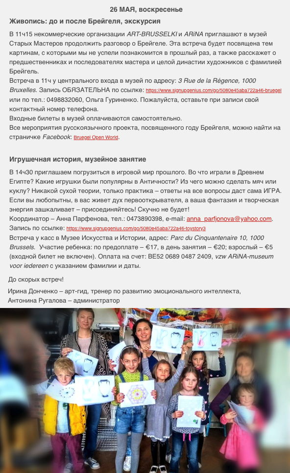 Координатор – Анна Парфенова, тел.: 0473890398, курьель : anna_parfjonova at yahoo.com. Запись по ссылке ниже. Встреча у касс в Музее Искусства и Истории. Участие ребенка: по предоплате – €17, в день занятия – €20; взрослый – €5 (входной билет не включен). Оплата на счёт: BE52 0689 0487 2409, vzw ARiNA-museum voor iedereen с указанием фамилии и даты.