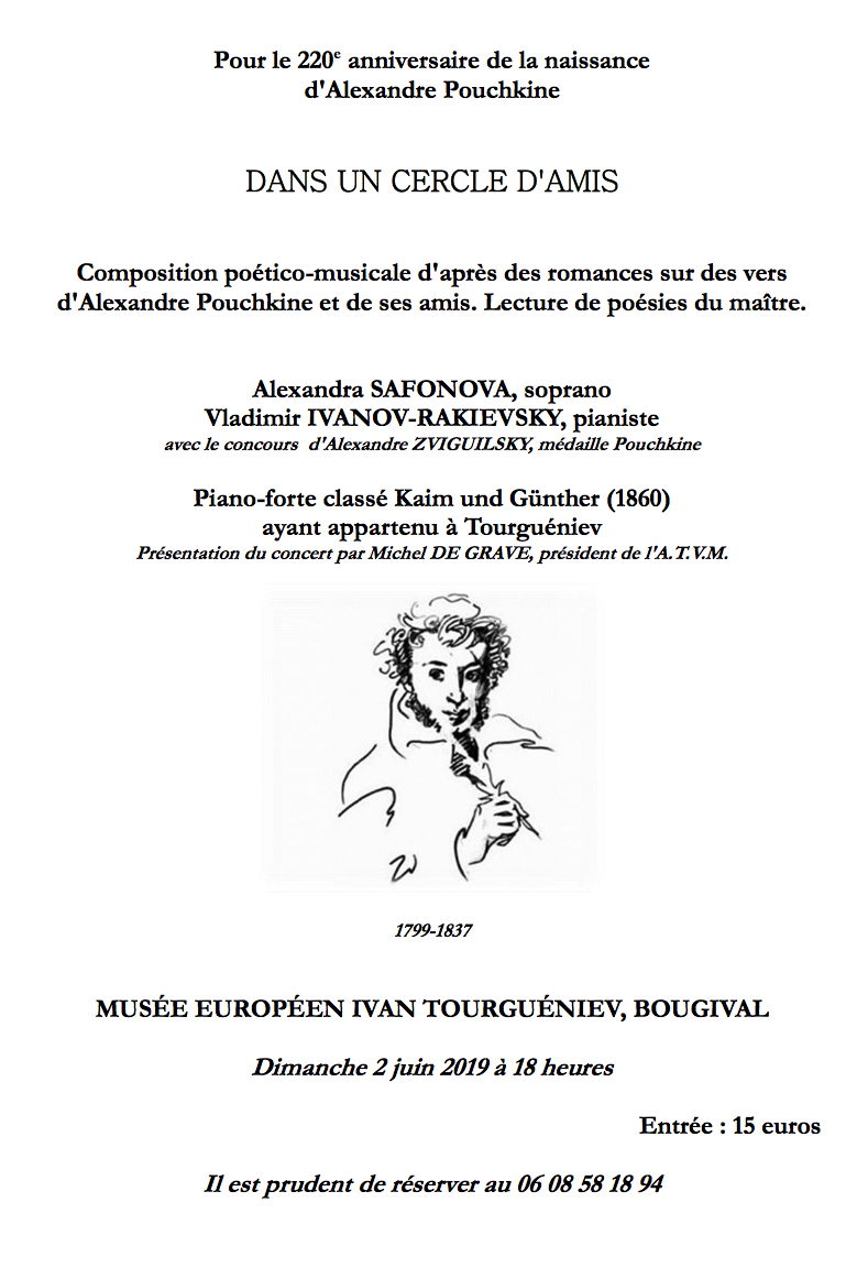 Le 2 juin prochain, la villa Tourgueniev à Bougival (à côté de Paris) vous invite pour une soirée d’exception autour de la musique et de la poésie. Alexandra Safonova, chanteuse soprano, sera accompagnée au piano par Vladimir Ivanov-Rakievsky pour vous présenter une composition d’après les romances sur vers du maître Pouchkine et de ses amis. Vous pourrez également entendre des lectures des poésies de l’écrivain. Il s’agit d’un événement à ne pas rater ! Pour le 220e anniversaire de la naissance d'Alexandre Pouchkine DANS UN CERCLE D'AMIS Composition poético-musicale d'après des romances sur des vers d'Alexandre Pouchkine et de ses amis. Lecture de poésies du maître. Alexandra SAFONOVA, soprano, Vladimir IVANOV-RAKIEVSKY, pianiste avec le concours d'Alexandre ZVIGUILSKY, médaille Pouchkine Piano-forte classé Kaim und Günther (1860) ayant appartenu à Tourguéniev Présentation du concert par Michel DE GRAVE, président de l'A.T.V.M.