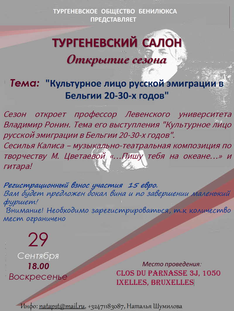 Тургеневский салон - Открытие сезона. Владимир Ронин Сезон откроет профессор Левенского университета Владимир Ронин. Тема его выступления « Культурное лицо русской эмиграции в Бельгии 20-30-х годов ». Сесилья Калиса – музыкально-театральная композиция по творчеству М. Цветаевой «…Пишу тебя на океане…» и гитара!