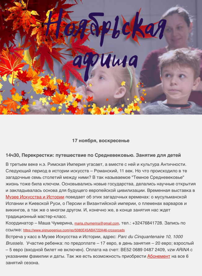 Цена – 25 евро/чел, входной билет включен. Для владельцев карты "Друзья музея" – 15 евро/чел. Оплата на счёт BE52 0689 0487 2409, vzw ARiNA с указанием имени и даты. До скорых встреч! Ирина Донченко – арт-гид, тренер по развитию эмоционального интеллекта, Антонина Ругалова – администратор