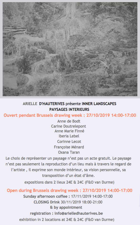 Cette exposition présente le travail de plusieurs artistes plasticiennes, dessinatrices, peintres et photographes qui chacune à sa manière révèle son paysage intérieur : Anne de Bodt — Carine Doutrelepont — Anne Marie Finné — Iberia Lebel — Corinne Lecot — Françoise Ménard — Oxana Taran Le choix de représenter un paysage n’est pas un acte gratuit. Le paysage n’est pas seulement la reproduction d’un lieu mais à travers le regard de l’artiste , il exprime son monde intérieur, sa vision personnelle, sa transposition d’un état d’âme. The choice of representing a landscape is not a free act. The landscape is not only the reproduction of a place but through the eyes of the artist, he expresses his inner world, his personal vision, his transposition of a state of mind. This exhibition presents the work of several artists, designers, painters and photographers who each in her own way reveals her inner landscape.