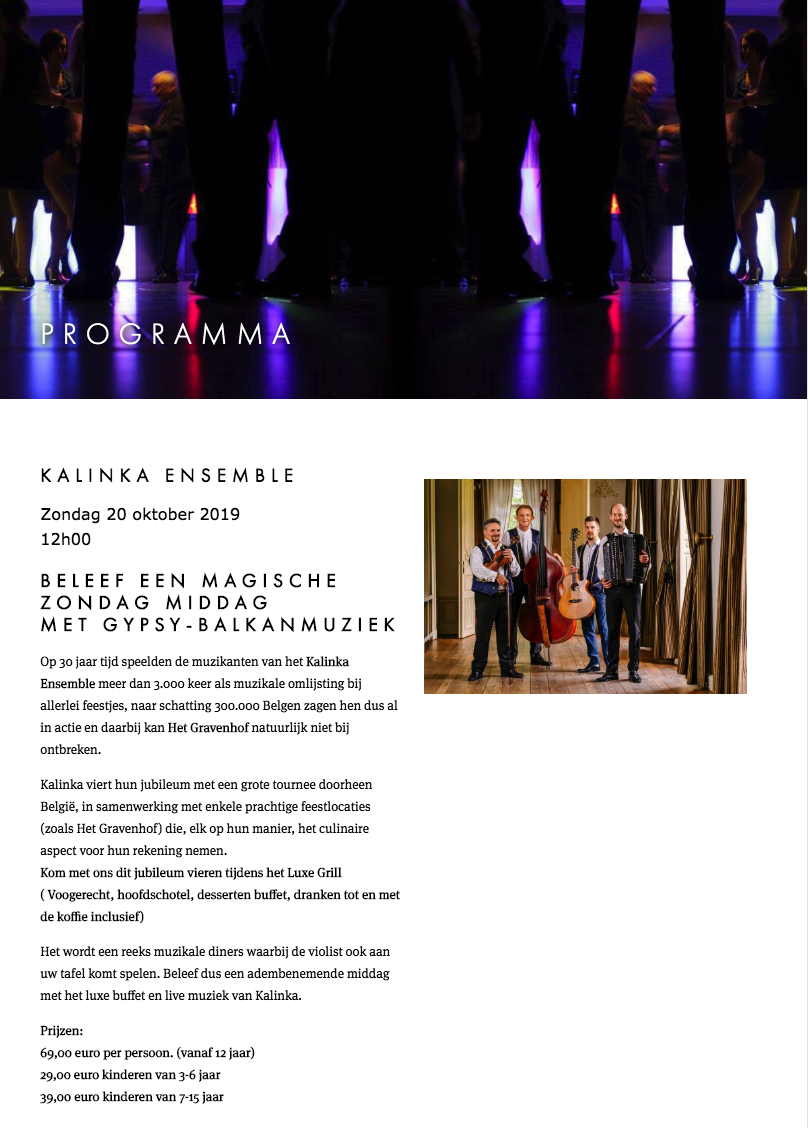 Musique tzigane jouée à votre table. 30 Jaar privefeesten - nu live voor iedereen Zowel culinair als muzikaal mag u het allerbeste verwachten op deze reeks feestelijke diners, waarmee Kalinka zijn 30e verjaardag viert. De muzikanten komen aan uw tafel spelen en zorgen met gypsy- en balkanmuziek voor de unieke sfeer. Elke feestzaal vult het culinaire aspect op zijn eigen creatieve manier in, en zorgt ook voor de feitelijke organisatie. Reserveer een tafel voor u en uw gezelschap rechtstreeks bij de feestzaal.