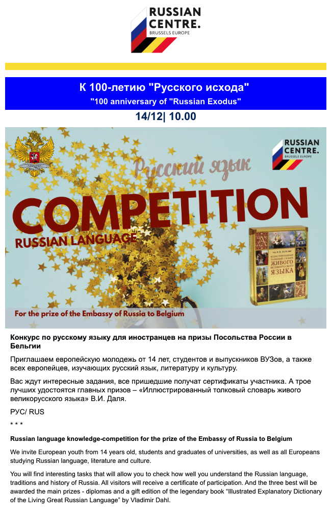 Diffusion de décembre 2019. Calendrier d'événements à caractère culturel russe.Calendrier d'événements à caractère culturel russe. Décembre 2019. Lien pour visualiser ce courriel dans votre navigateur : Mail/RC_Mailing_December_01,_2019.html | Calendrier vava.be décembre 2019 | Liste des intitulés | Album des affiches/illustrations | Descriptifs détaillés | Nouvelles affiches | Diaporama 1 → 100 ans culture russe (Bruxelles) 3,11 → Médias de grand chemin (Ixelles) 3 → Promenade en Carélie (Paris) 4,7-8, 12-14 → Casse noisette (Bruxelles/LLN/Oostende/Antwerpen) 5-6 → Lac des Cygnes (Bruxelles) → 6 Research Fellowships (London) 6 → Jahrezeiten Rachmaninow/Scriabin (Bad Homburg) 6 → Concert Noël Dzvinha (Forrières) 7 → Вечер песен и стихов (Sossenheim) 7,28 → Гастротур (Gent) 7-8 → Неоконченный роман (Antwerpen/Den Haag) 7 → Belfius art collection (Bruxelles) → 8 Anatevka (Antwerpen/Gent) 8 → Дело о средневековом убийстве (Bruxelles) 11,25,29/12-1/1 → Chœur d'hommes Alexandre Nevsky (Guebwiller/Paris) 11→ Russia cultural powerhouse (Woluwé-Saint-Lambert) 13,15,17-18 → Choeurs Armée Russe (Huy/Namur/Frameries/Mouscron/Ath) 13 → Ma Russie (Watermael) 14 → Christmas Concert (Bruxelles) 14-15 → Chantres Orthodoxes Russes (Roscoff/Crozon)