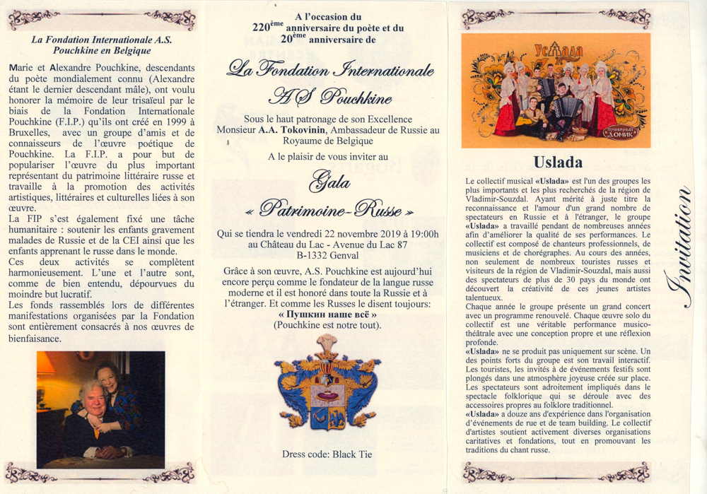 | 15 → Vente Art russe (Paris) 16-18 → Auction russian art (Monaco) 16 → Qualification Euro 2020 : Russie-Belgique (Bruxelles) 19 → Conférence sur Pouchkine(Saint-Josse) 19 → Conférence Retour Russie en Afrique (Jodoigne) 19-24 → Triomphe de l’Art (Bruxelles) 21 → Financing products in EEU (Bruxelles) 22 → Gala Pouchkine 2019 (Genval) 23 → Toon Fret & Veronika Iltchenko (Ixelles) 24 → Swan Lake on the Water! (Laeken) → 30 Vassily Polenov - France terre de création et d’exil (Paris) 27-30 → inner landscapes (Bruxelles) 24/11-8/12 → Anatevka. Fiddler on the roof (Antwerpen/Gent) → 10-19/12 Je veux voir Mioussov (Paris) → 24/12 Minin(g) Charleroi (Marcinelle) 7/10-1/2/2020 → Ballet - Hommage aan Maurice Ravel (Oostende/Longuenesse/Antwerpen/Mons/Gent/Liège)
