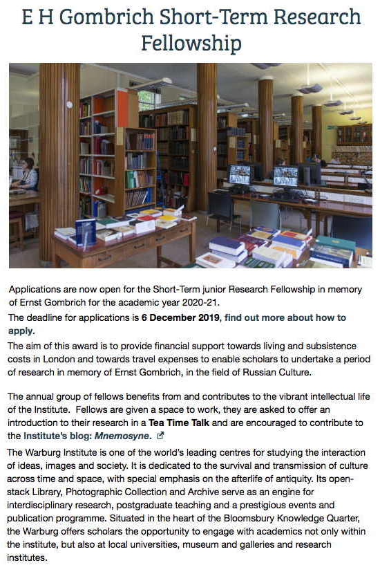 Сайт/Site : https://warburg.sas.ac.uk/research/fellowships/funded-research-fellowships/e-h-gombrich-short-term-research-fellowship
