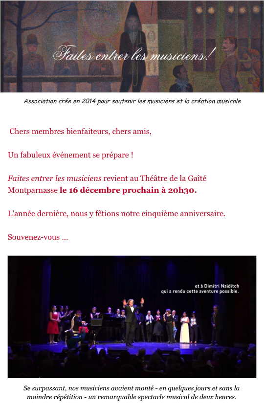 | 14 → Excursion autobus (Cologne/Bonn) 14-15 → Noël couleurs Russie (Forrières) 14 → Рождество Click Club (Aartselaar) 15,17,21 → Ballets Moroshka (Aix/Pau/Annecy) 16 → Faites entrer les musiciens (Paris) → 19 Je veux voir Mioussov (Paris) 19-20 → Concert de Noël (Bruxelles) 19 → Noël - Musiques de films (Paris) → 20 Intarsien-Kreativ Natur (Sossenheim) → 20 Tziganes 2 Guerre mondiale (Guipavas) 20-21 → Fille des neiges (Bruxelles) 20-31 → The Nutcracker (Sint-Niklaas/Namur/Bruxelles/Liège/Berlin) 22 → De Notenkraker (Beernem) 22 → Новогодняя сказка (Ougrée) → 24 Minin(g) (Marcinelle) 27-30 → Casse-Noisette (Bruxelles) 28-30 → De notenkraker(Gent/Forest) 29 → Брейгель в черно-белом (Bruxelles) → 5/1 Rodchenko. Kazan Art (Saint-Josse) → 31/1 ERA.Net RUS Plus Call 2019 (Gent) → 1/2 Hommage Maurice Ravel (Oostende/Longuenesse/Antwerpen/Mons/Gent/Liège)