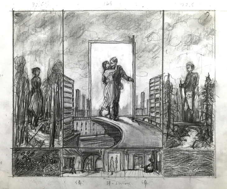 Exposition de peintures de Sasha Drutskoy. | Etude au crayon pour le Polyptique composé de 8 peintures, huile sur toile, structure bois, 230 x 310 cm. |