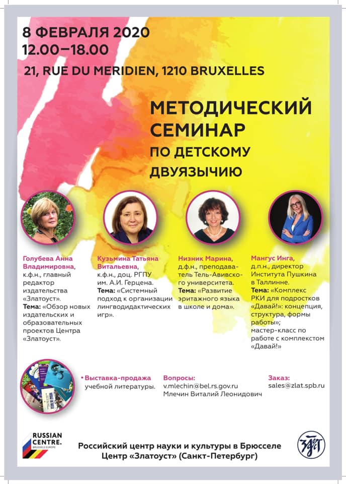| 16/2 → По старинным рецептам (Leuven) 15/2 → Open Laboratory 2020 - 7+ (Saint-Josse) 16/2 → Пластилиновый спектакль - 4+ (Antwerpen) 16/2 → Экскурсия в музей Плантена (Antwerpen) 18/2 → Concert « Winter Fantasies » (Saint-Josse) 18/2-25/3 → La magie de l'aquarelle (Saint-Josse) 20/2-20/3 → Elena Preis & Vassily Pavlovsky (Bruxelles) 23/2 → Uitbundige Russische Dansen (Oostende) 23/2 → Поль Дельво. Человек, любивший поезда (Schaarbeek) 24-28/2 → Stage Сarnaval (Uccle) 25/2 → Крокус-каникулы в лагере Радуга (Antwerpen) 25-27/2 → Swan Lake (Mons/Liège) 26/2 → Challenges of Authoritarian Citizenship (Gent) 28/2 → Giacomo Quarenghi et Saint-Pétersbourg (Watermael-Boitsfort) 29/2 → Царевна-лягушка (Haarlem) 21/2-1/3 → Birds, by the Way / Chess. Shakhmaty / Zdravstvujte, rodniye (Ixelles) 21/2-1/3 → Le Lac des Cygnes. Het Zwanenmeer (Forest)/Antwerpen) 29/2-1/3 → Самая-самая... аватюрная комедия (Antwerpen/Den Haag) → 15/3 Alexandra Demenkova. Contretype (Saint-Gilles) → 21/3 Je danserai pour toi. Le fruit de nos entrailles (Paris)