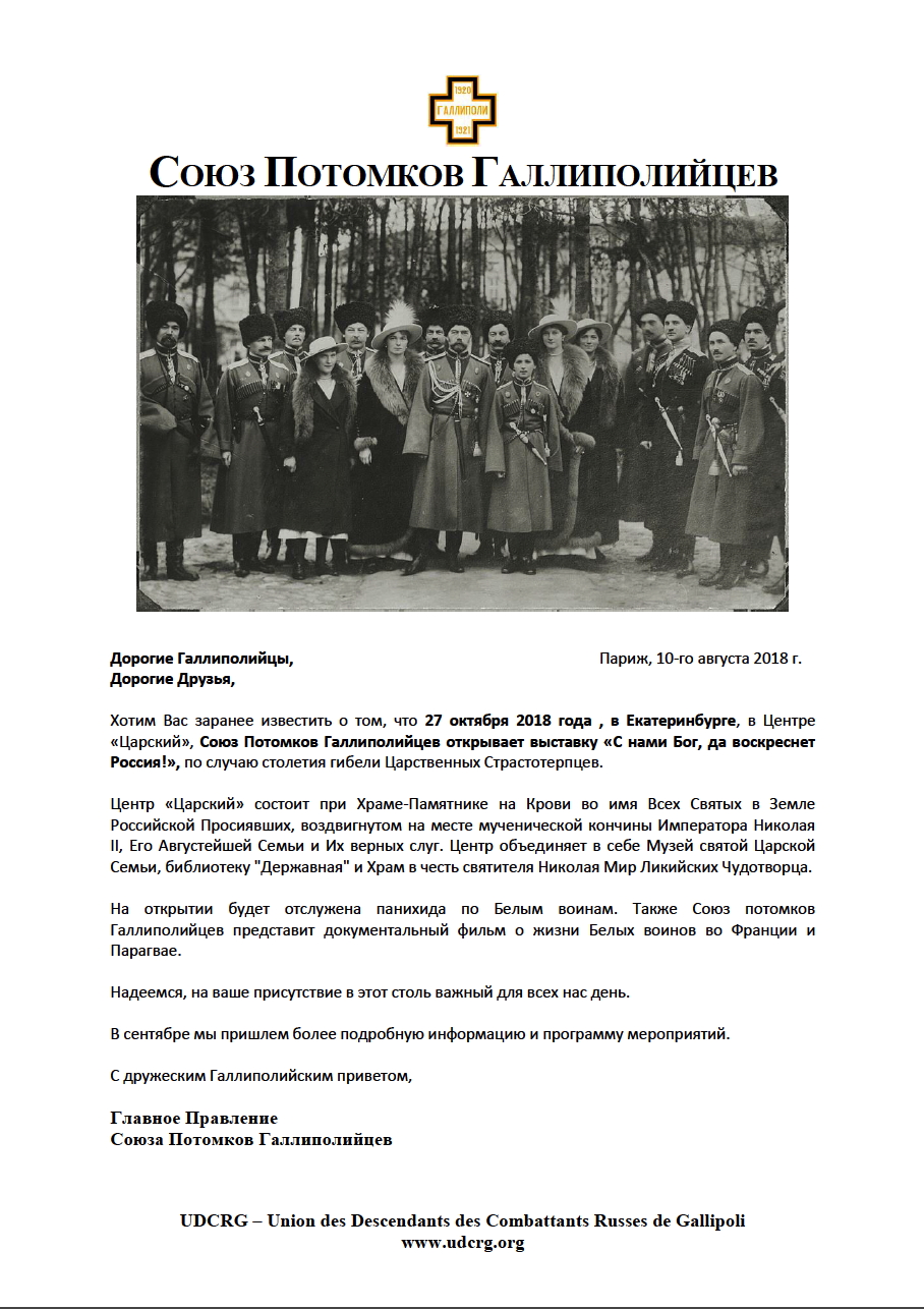 Дорогие друзья, Надеемся, что вы хорошо провели отпуск и готовы вместе с нами участвовать в подготовке организации Дня Памяти Белого движения в воскресенье 9 декабря 2018 года. Для тех, кто недавно присоединился к нам, вы найдёте в Приложении 1 историческое объяснение причин проведения этого Дня, а также программу его проведения. Новости : Мы создали Ассоциацию « 100-летие Белого движения » сроком на один год. В Приложении 3 вы найдете афишу, которая передает образ нашего мероприятия. Плакат завершен и будет доступен в наиболее посещаемых местах (собор, приходы, мэрии 8-го района Парижа и Булони, книжный магазин Les Editeurs Réunis...) со следующей недели. Мэрии 8-го района Парижа и Булони согласились распространять информацию через свои журналы. Наш сайт www.mouvementblanc.com будет действовать с конца сентября. Выставка : Как мы ранее сообщали вам, помимо фотовыставки военных и гражданских лидеров Белого движения, сцен гражданской войны, образов и документов, относящихся к деятельности Российского Красного Креста (старой организации) и эпопеи Галлиполи, мы предлагаем вам выставить фотографии и документы неизвестных истории лиц (как гражданских, так и военных), которые участвовали в Белом Движении, потомками или близкими родственниками, которых вы являетесь и которые вы хотели бы представить общественности. Может быть, это последняя возможность воздать должную память тем мало известным людям, которые во имя свободной России пожертвовали своей молодостью, своим благополучием и зачастую своей жизнью. С этой целью мы организуем встречу во вторник, 25 сентября, в 18:30 в Александро-Невском соборе для желающих принять участие в этой часте выставки, чтобы мы могли вместе согласовать единый стиль (цвета панелей, тип и размер шрифтов...) и, таким образом, придать определенную однородность выставке. Финансирование : Для того, чтобы этот день прошел успешно, мы считаем, что он должен быть организован на лучшем уровне. Сумма предвиденных расходов: аренда палатки, стульев, отопительных приборов, оборудование для конференций (микрофон и громкоговорители, экран, проекторы), непосредственно выставки (фотографии, выставочные стенды, освещение), выступления, реклама ... всё оценивается приблизительно в 10 000 евро. Если вы, также, как и мы, считаете, что это событие является исторически важным и желаете оказать помощь в его реализации, то вы можете сделать это, отправив ваше пожертвование чеком на имя Ассоциации Centenaire du Mouvement Blanc либо переводом на счет (RIB в Приложении 2). Нам позволено выдавать расписку на пожертвования для налоговой инспекции дающая право на снижение налогов. Если у вас есть вопросы, то пишите или звоните нам Елена Бурлакова, Секретарь.