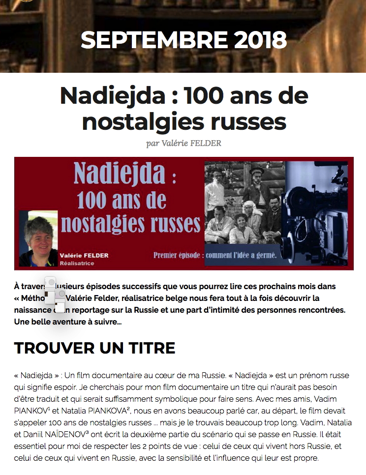 Trouver un titre ; Le cheminement ; La question ; La ligne du temps. À travers plusieurs épisodes successifs que vous pourrez lire ces prochains mois dans « Méthode », Valérie Felder, réalisatrice belge nous fera tout à la fois découvrir la naissance d’un reportage sur la Russie et une part d’intimité des personnes rencontrées. Une belle aventure à suivre…
