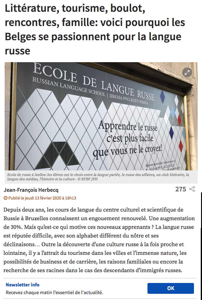 Сайт/Site : https://www.rtbf.be/info/societe/detail_litterature-tourisme-boulot-rencontres-famille-voici-pourquoi-les-belges-se-passionnent-pour-la-langue-russe?id=10426570