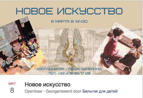 Openbaar · Georganiseerd door Бельгия для детей Приглашаем детей и их родителей отправиться в эпоху « последнего большого стиля ». Экспонаты музея расскажут нам о противоречивом искусстве прошлого века. А игра в духе произведений Льюиса Кэрролла позволит присмотреться к нему поближе. И, конечно же, нас ждёт традиционный мастер-класс. Ведущая программы – Ирина Донченко. « Охотники за древностями » снова отправляются в прошлое. Конец 19го века принес в жизни людей очень многое. Это и новые открытия, и новые изобретения, и новое искусство. Канули в лету корсеты и кринолины, тяжелая роскошь барокко и лаконичный классицизм. На смену им пришел « последний большой стиль ». Музейные экспонаты станут для нас проводниками в эпоху Ар-Нуво, так же нас ждут небольшая поисковая игра и традиционный мастер-класс. Занятие проводится на русском языке.