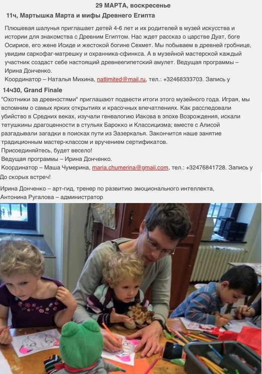 Cемейная встреча в музее Плюшевая шалунья приглашает детей 4-6 лет и их родителей в музей искусства и истории для знакомства с Древним Египтом. Нас ждет рассказ о царстве Дуат, боге Осирисе, его жене Исиде и жестокой богине Сехмет. Мы побываем в древней гробнице, увидим саркофаг-матрешку и охранника-сфинкса. А в музейной мастерской каждый участник создаст себе настоящий древнеегипетский амулет. Ведущая программы – Ирина Донченко. 14ч30, Grande Finale - семейное занятие в музее « Охотники за древностями » приглашают подвести итоги этого музейного года. Играя, мы вспомним о самых ярких открытиях и красочных впечатлениях. Как расследовали убийство в Средних веках, изучали генеалогию Иакова в эпохе Возрождения, искали тетушкины драгоценности в стульях Барокко и Классицизма; вместе с Алисой разгадывали загадки в поисках пути из Зазеркалья. Закончится наше занятие традиционным мастер-классом и вручением сертификатов. Присоединяйтесь, будет весело! Ведущая программы – Ирина Донченко. До скорых встреч! Ирина Донченко – арт-гид, тренер по развитию эмоционального интеллекта, Антонина Ругалова – администратор