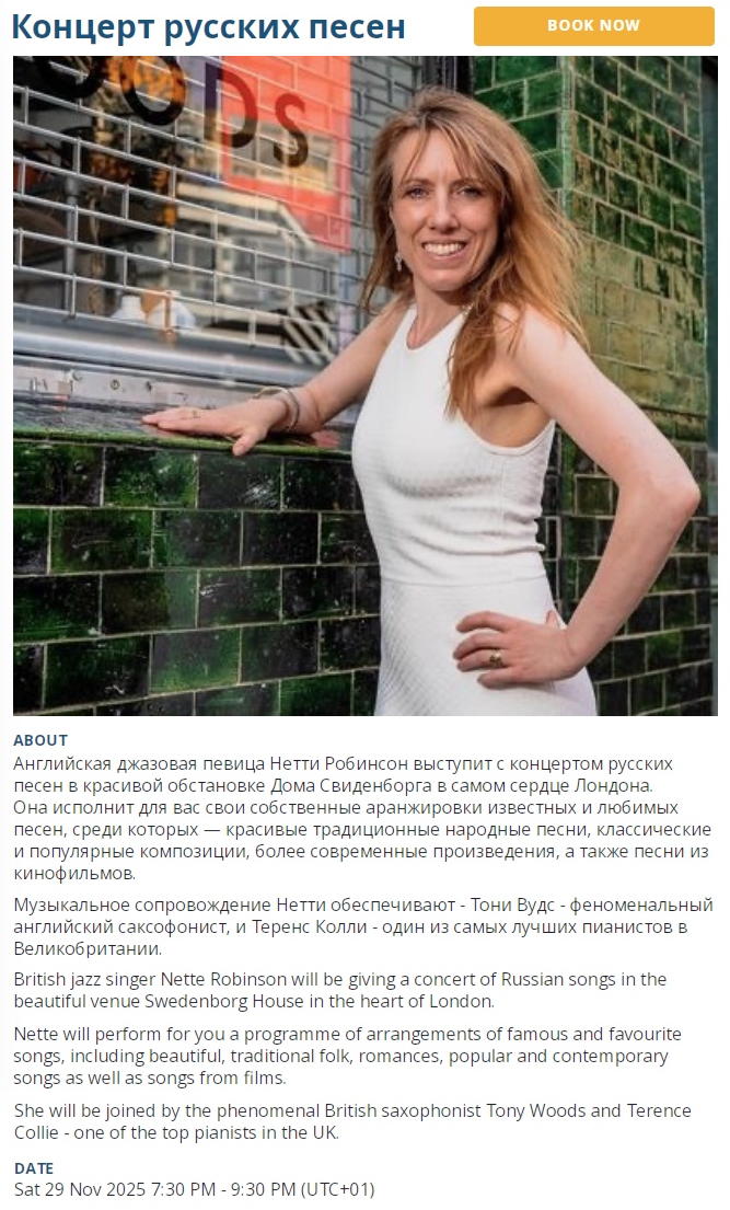 Nette Robinson Английская джазовая певица Нетти Робинсон выступит с концертом русских песен в красивой обстановке Дома Свиденборга в самом сердце Лондона. Она исполнит для вас свои собственные аранжировки известных и любимых песен, среди которых — красивые традиционные народные песни, классические и популярные композиции, более современные произведения, а также песни из кинофильмов. Музыкальное сопровождение Нетти обеспечивают - Тони Вудс - феноменальный английский саксофонист, и Теренс Колли - один из самых лучших пианистов в Великобритании. Перейдите по ссылке, чтобы узнать подробности и купить билеты. British jazz singer Nette Robinson will be giving a concert of Russian songs in the beautiful venue Swedenborg House in the heart of London. Nette will perform for you a programme of arrangements of famous and favourite songs, including beautiful, traditional folk, romances, popular and contemporary songs as well as songs from films. She will be joined by the phenomenal British saxophonist Tony Woods and Terence Collie - one of the top pianists in the UK. Click on the link for more details and to purchase tickets.