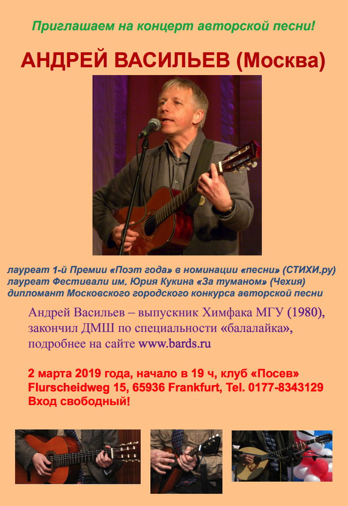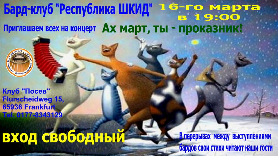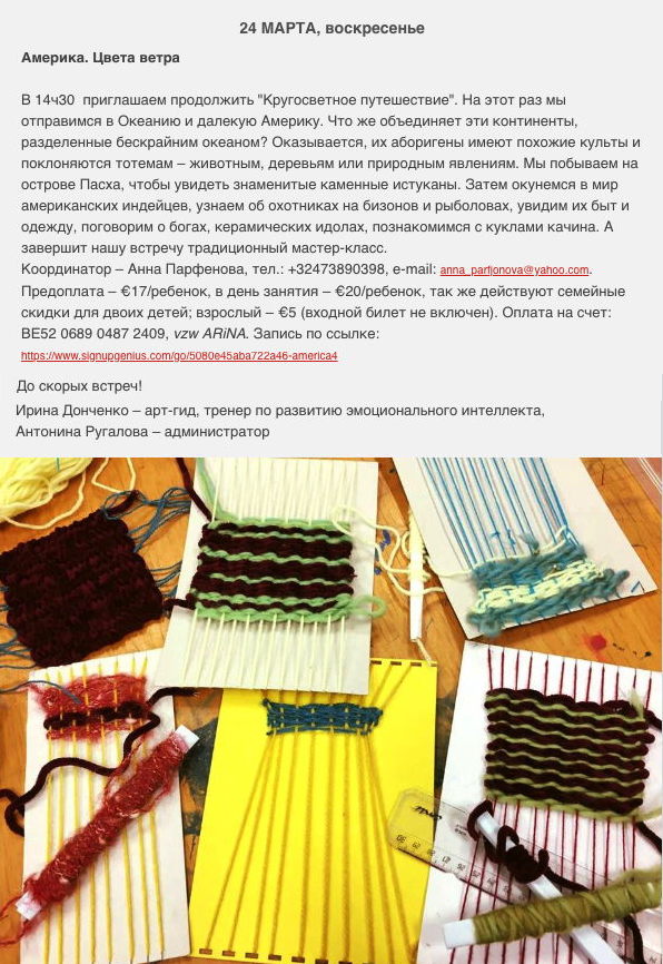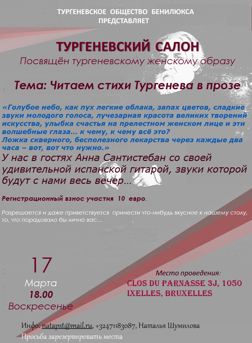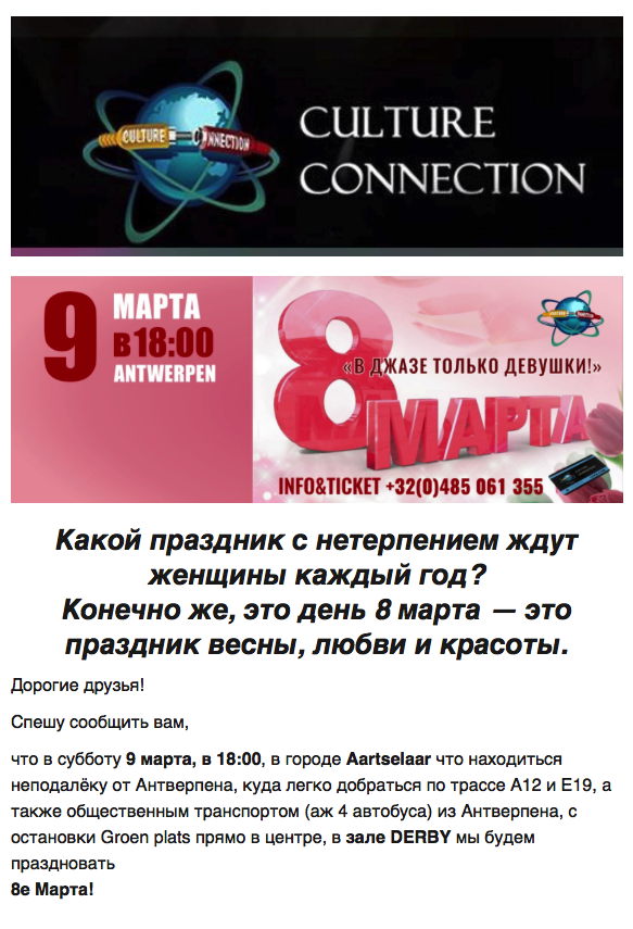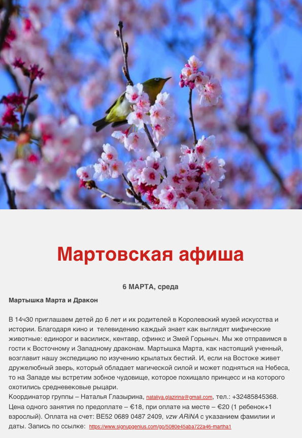 1 Concert Gift for Ladies, Saint-Josse 1,2,6 => Tsjechovs Platonov, Halle, Herent, Berchem 2,7-8 => Drie Zusters, Rotterdam/Amsterdam 2 => Едет масленица дорогая, Uccle 2 => Концерт авторской песни, Sossenheim 2-3 => Спектакль Нежданчик, Antwerpen/Den Haaag => 3 Art russe - vente en ligne, Internet 3 => Blinis, Etterbeek 4 => Den' Pobedy, Bruxelles 6 => Мартышка Марта и Дракон, Bruxelles 7 => Cooking/Sculpting & molding, Saint-Josse 9 => Праздник весны, Aartselaar 10-13 => Mission to West Siberian Region 10 => Sleeping Beauty, Kinepolis 11-19 => Quand les russes s'enflamment, Paris 13,15,16 => Drie zusters, Dilbeek, Mechelen, Lier 14,21,28 => Géopolitique Russie, Woluwé-Saint-Lambert 14,21 => Russische helden, Sint-Truiden 15 => Sous le signe des songes, Neuilly/Seine 16-17 => Irina Lankova, BeauvechainLasne 16 => Ах март, ты проказник, Sossenheim