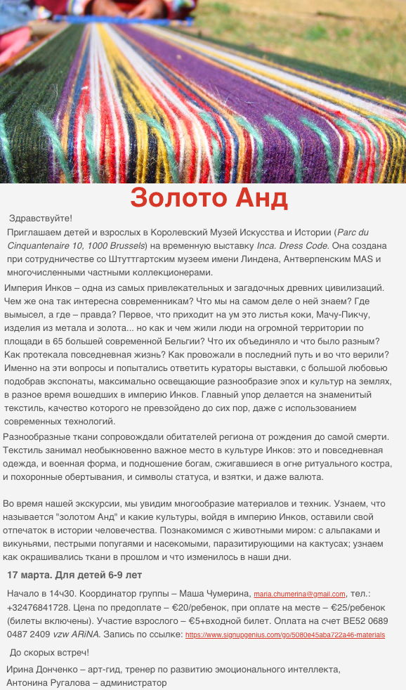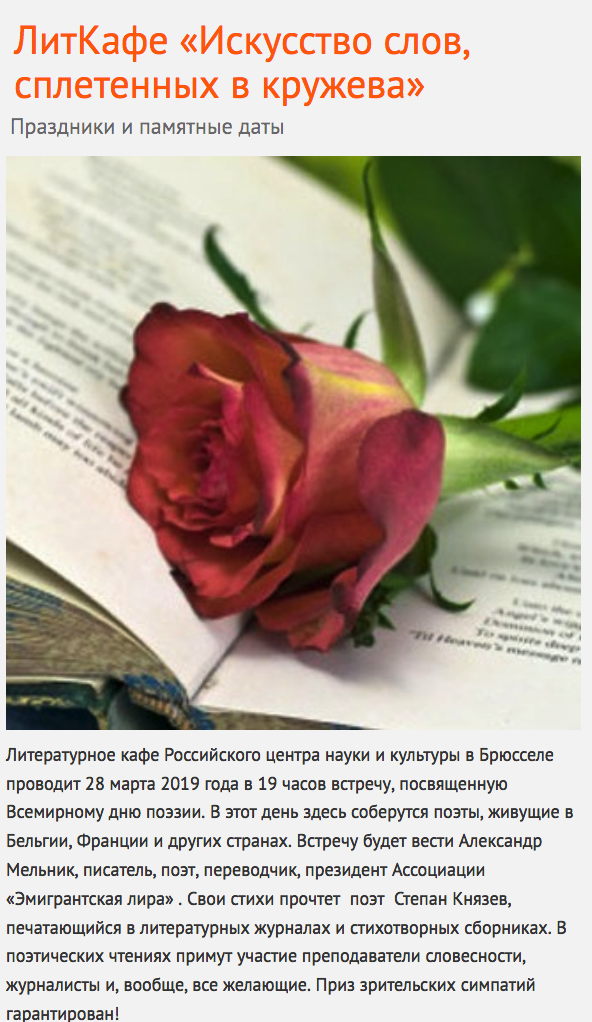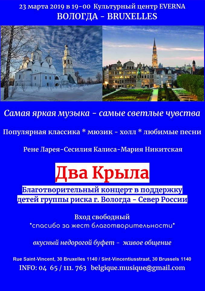 | 16 => Музей Африки, Tervueren 17 => Живопись до и после Брейгеля, Bruxelles 17 => Загадочное искусство Анд, Bruxelles 17 => Тургеневский Салон, Ixelles 19 => Liefde is aardappelen, Gent 19 => Excursion, de Haar/Utrecht 20 => Den beer heeft mij gezien, Strombeek-Bever 20 => Человек, который удивил всех, Paris 20 => Russian Internet Strategic Visibility, Gent 21 => België-Russia. Business Table. 21 => Euro 2020 Belgique-Russie, Laeken 22 => Tzar Saltan, Bruxelles 23-24 => Excursion Mont-Saint-Michel, France 24 => 100 ans d'émigration - groupe Karandash, Saint-Josse 24 => Mullova & Beatson, Vioolsonaten, Antwerpen 24 => Америка. Цвета ветра, Bruxelles 25 => Russia Philharmonic Orchestra, Ixelles 29 => Volodymyr Kurylenko, Maastricht 30 => Concert de clôture « Feu », Tourinnes-La-Grosse 30 => Hedgehog - Ёжик, Antwerpen 31 => Vitaly Pisarenko, Scherpenheuvel-Zichem