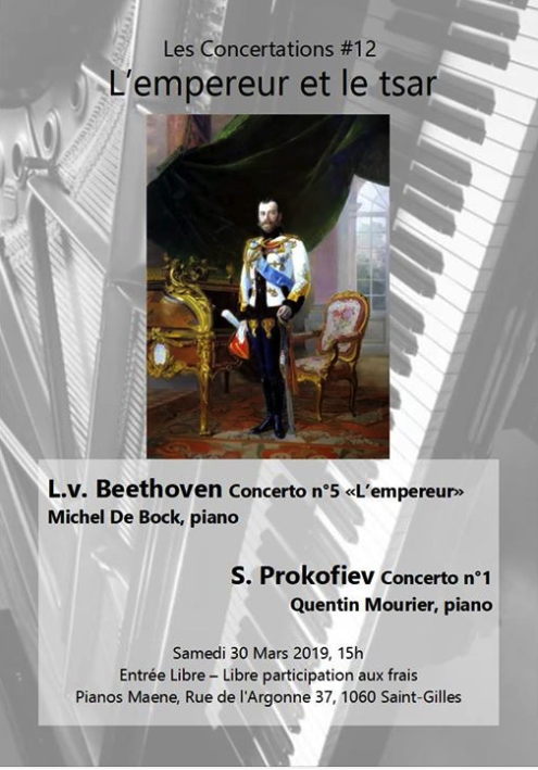 Organisé par Les Concertations #12. Le cinquième concerto de Beethoven tient sûrement son surnom "L'Empereur" du fait qu'il s'agit du plus grandiose de tous. Riche en contrastes, l'oeuvre fut écrite lors du siège de Vienne par les français qui fut une épreuve difficile pour le compositeur. A côté de cette oeuvre de maturité, le premier concerto pour piano de Prokofiev était un travail de fin d'études : le compositeur le créa lui-même pour prouver sa virtuosité. On y trouve des thèmes très lyriques, des rythmes de danse et l'imitation d'un carillon retentissant. L.v. Beethoven : Concerto n°5 « L'Empereur » S. Prokofiev : Concerto n°1 Michel De Bock & Quentin Mourier, pianos
