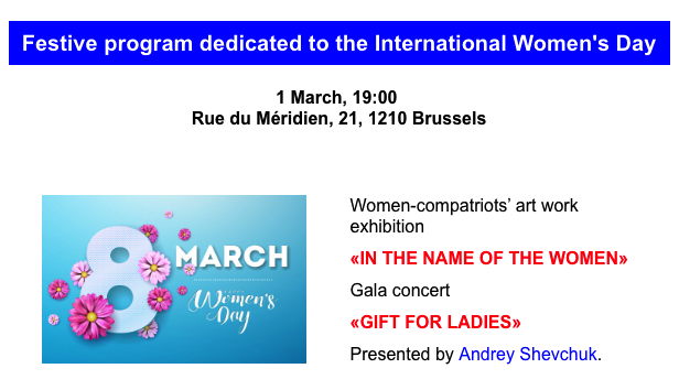 Women-compatriots’ art work exhibition « In the name of the Women » Gala concert « Gift for Ladies » dedicated to the International Women’s day You will hear a fascinating tale about women's images and women in the music industry, from Karmen to Paulina Viardo The festive program is offered to you by the opera-symphonic conductor, art director of the International Russian choral assemblies and opera festivals in France. Andrei Shevchuk