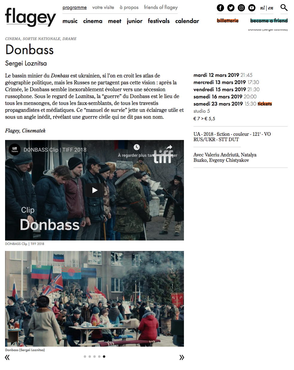 Вход: 7 евро Главная героиня фильма, Елена Суховий, представит вам филь и ответит на все ваши вопросы. Дом кино/filmhuis Klappei находится в 600 метрах пешком от центральной станции Антверпена. (Klappeistraat соединяет Kerkstraat с Lange Beeldekensstraat)