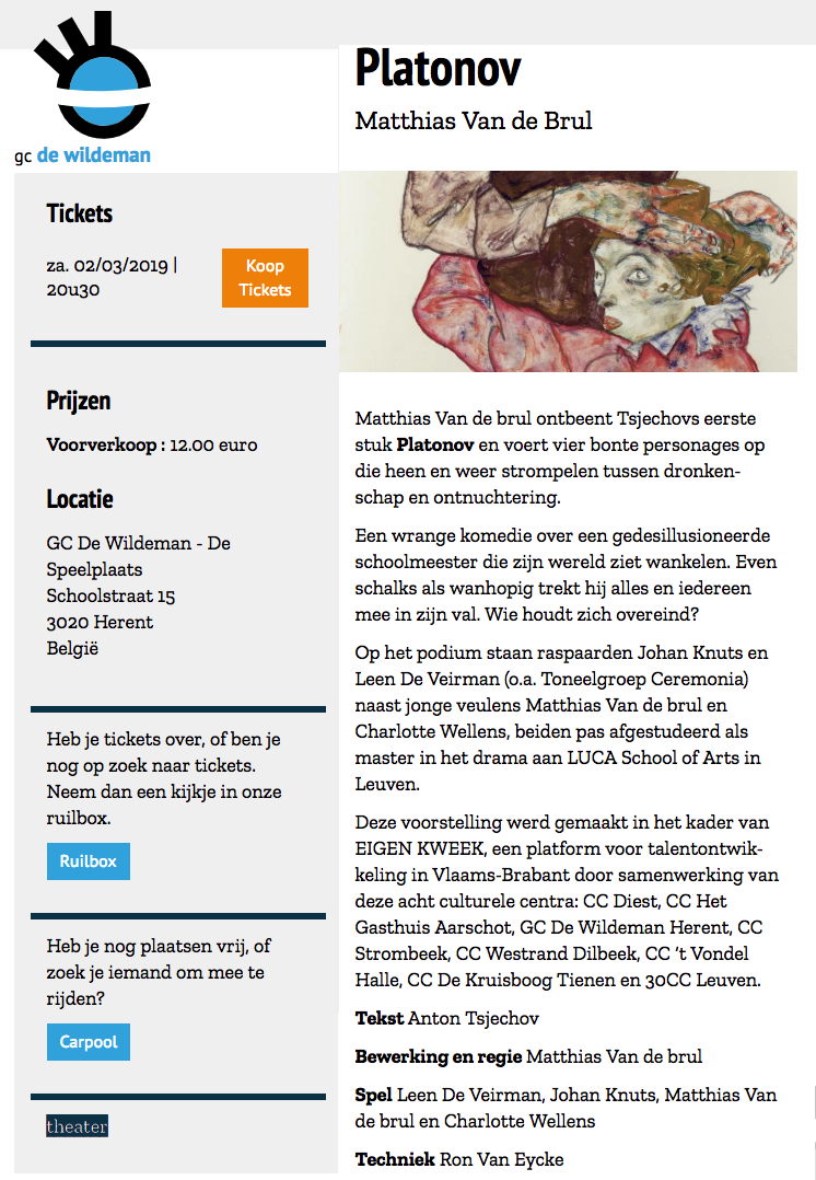Deze voorstelling werd gemaakt in het kader van EIGEN KWEEK, een platform voor talentontwikkeling in Vlaams-Brabant door samenwerking van deze acht culturele centra: CC Diest, CC Het Gasthuis Aarschot, GC De Wildeman Herent, CC Strombeek, CC Westrand Dilbeek, CC ‘t Vondel Halle, CC De Kruisboog Tienen en 30CC Leuven. Tekst : Anton Tsjechov Bewerking en regie : Matthias Van de brul Spel : Leen De Veirman, Johan Knuts, Matthias Van de brul en Charlotte Wellens Techniek : Ron Van Eycke Coproductie : De Nwe Tijd, Het nieuwstedelijk Met dank aan Peter Anthonissen, Ellis Meeusen en Dirk Van de brul