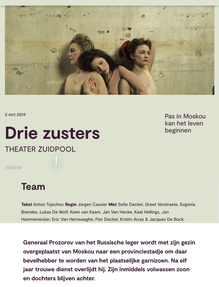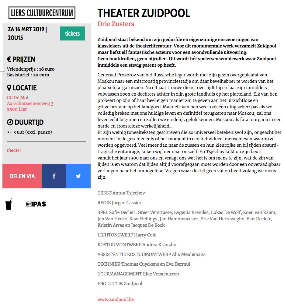 Theater Zuidpool Pas in Moskou kan het leven beginnen. Generaal Prozorov van het Russische leger wordt met zijn gezin overgeplaatst van Moskou naar een provinciestadje om daar bevelhebber te worden van het plaatselijke garnizoen. Na elf jaar trouwe dienst overlijdt hij. Zijn inmiddels volwassen zoon en dochters blijven achter. Ze proberen allemaal zin te geven aan het uitzichtloze, grijze bestaan op het landgoed, maar ze weten dat het leven pas echt beginnen kan als ze breken met het leven dat ze leiden. In Moskou is geluk pas mogelijk. Moskou is hun fata morgana. Veel meer dan naar de zussen en hun kleurrijke types om hen heen kijken wij naar onszelf. En Tsjechov kijkt mee, vanuit het jaar 1900 en vraagt ons wat het is om mens te zijn en wat de zin van lijden is. In deze voorstelling zit een pauze. Tekst Anton Tsjechov Regie Jorgen Cassier Met Sofie Decleir, Greet Verstraete, Evgenia Brendes, Lukas De Wolf, Koen van Kaam, Jan Van Hecke, Kaat Hellings, Jan Hammenecker, Eric Van Herreweghe, Flor Decleir, Kristin Arras & Jacques De Bock.