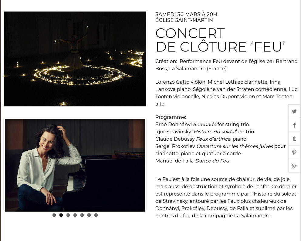 Festival International de Musique. 4ème édition. Création : Performance Feu devant de l’Église par Bertrand Boss, La Salamandre (France) Lorenzo Gatto violon, Michel Lethiec clarinette, Irina Lankova piano, Ségolène van der Straten comédienne, Luc Tooten violoncelle, Nicolas Dupont violon et Marc Tooten alto. Programme : Ernő Dohnányi Serenade for string trio Igor Stravinsky ‘Histoire du soldat’ en trio Claude Debussy Feux d’artifice, piano Sergei Prokofiev Ouverture sur les thèmes juives pour clarinette, piano et quatuor à corde Manuel de Falla Dance du Feu Le Feu est à la fois une source de chaleur, de vie, de joie, mais aussi de destruction et symbole de l’enfer. Ce dernier est représenté dans le programme par l’’Histoire du soldat’ de Stravinsky, entouré par les Feux plus chaleureux de Dohnányi, Prokofiev, Debussy, de Falla et sublimé par les maitres du feu de la compagnie La Salamandre.