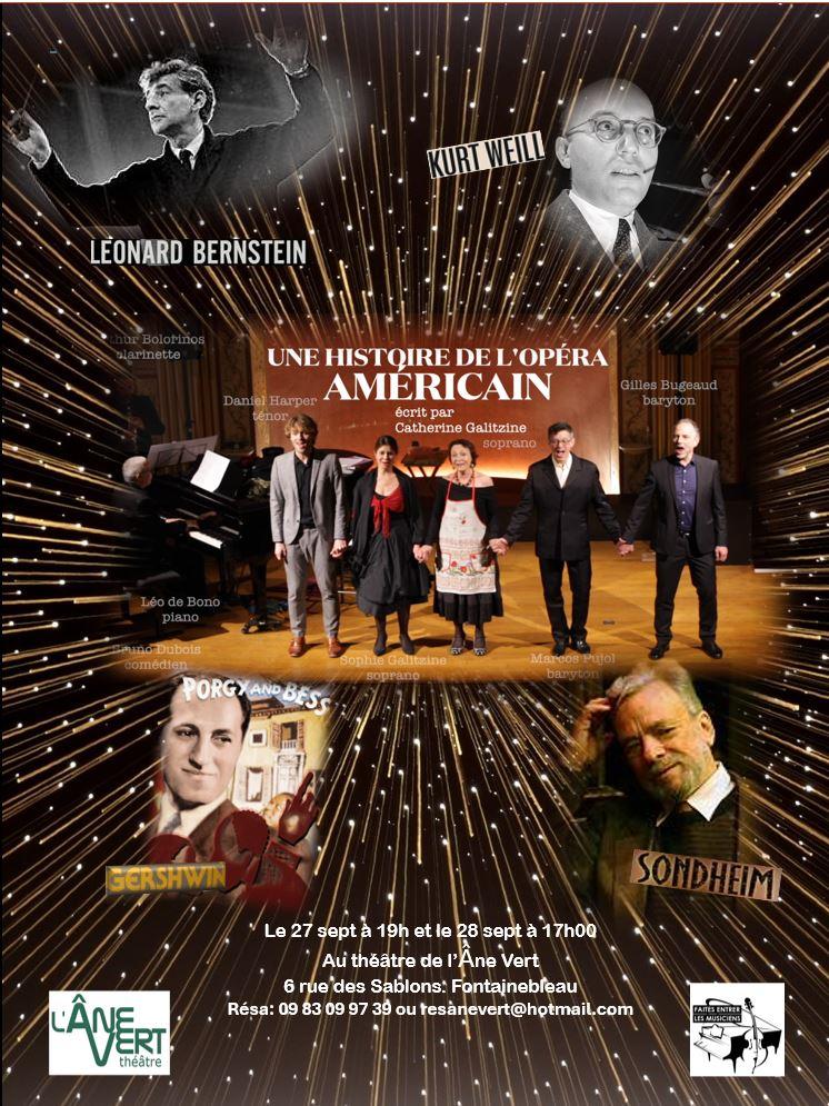 Chers amis, chers bienfaiteurs, « Une histoire de l'opéra américain » (que vous avez peut être déjà vu en format Lecture-concert) a été réécrit par mes soins sous forme de pièce de théâtre musicale et présenté pour la première fois, cet été, au Festival de l'Ile aux Moines. Nous avons joué et chanté devant 450 spectateurs et d'après les retours du directeur du Festival, Hervé Masquelier, la performance a été saluée à l'unanimité. A présent, je suis fière de vous annoncer que l'aventure continue. « Une histoire de l'opéra américain » va être donné le samedi 27 sept à 19h00 et le dimanche 28 septembre, à 17h00. à Fontainebleau! Notre nouveau spectacle a été sélectionné par Yves-Patrick Grima pour ouvrir la saison du Théâtre de L'Âne Vert, 6 rue des Sablons à Fontainebleau ! Si vous aimez la comédie musicale, ce spectacle est pil-poil pour vous! Venez découvrir comment quatre compositeurs de Broadway , de Georges Gershwin à Stephen Sondheim en passant par Léonard Bernstein et Kurt Weill, ont bousculé les codes et inventé un nouveau style d'opéra, distrayant et accessible à tous! Amicalement, Catherine Galitzine Catégorie : Théâtre musical | Type : Spectacle Bordereau → notice (réservé) | Inscription | Liens → agenda similaires | livres-souvenirs | Privé | ||||||||||||||