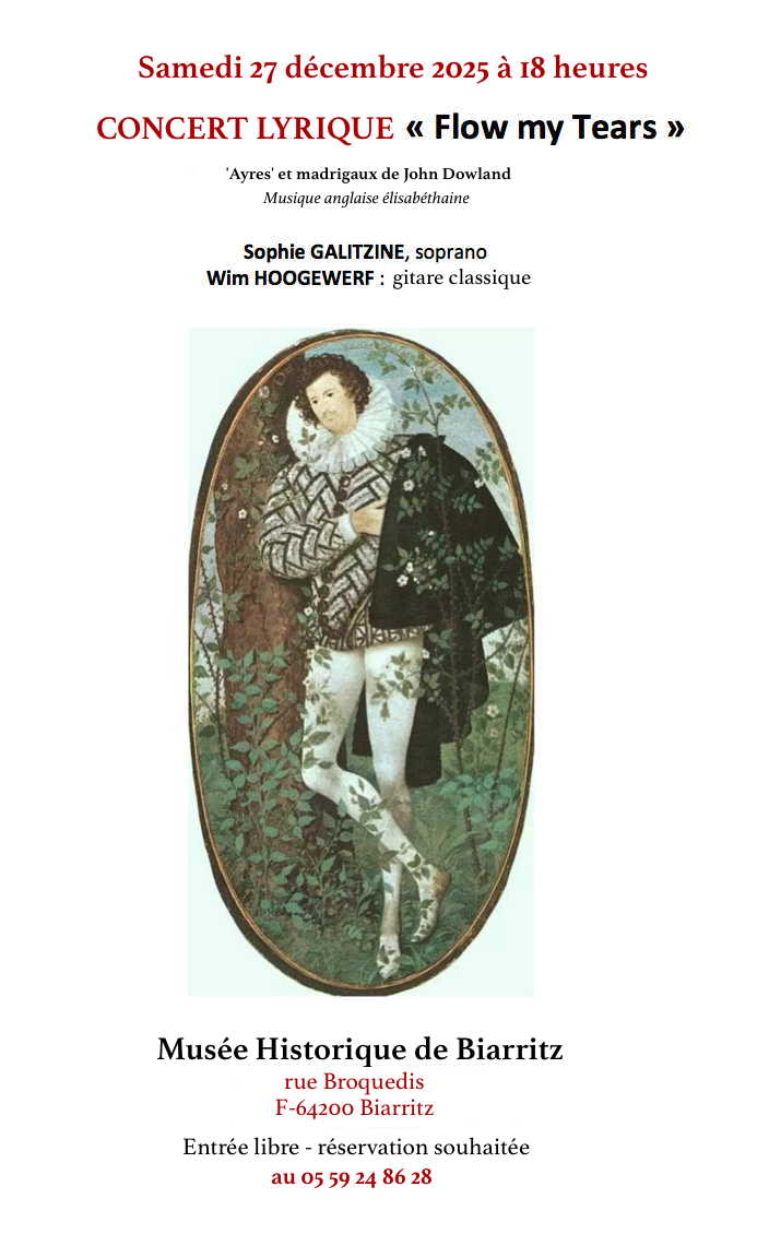 Concert « Flow my Tears » et madrigaux de John Dowland.Musique anglaise « élisabéthaine » par Sophie GALITZINE, soprano en Wim HOOGEWERF, guitare classiqueMusée Historique de Biarritz, rue Broquedis, F-64200 Biarritz le samedi 27 décembre 2025 — à 18h00' Entrée libre – Réservation souhaitée au 05 59 24 86 28 https://www.destination-biarritz.fr/fete-manifestation/concert-flow-my-tears-ayres-et-madrigaux-de-john-dowland/